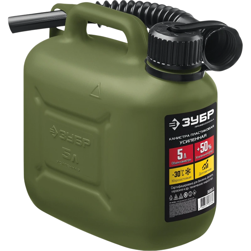Пластиковая канистра ЗУБР 38365-5 предназначена для хранения и транспортировки топлива и технических жидкостей. Устойчива к механическим воздействиям даже при отрицательных температурах (до -30°C). Особо прочные утолщенные стенки. В состав пластика входят антистатические добавки. Крышка с маслобензостойким уплотнителем. Гибкий носик для заливки ГСМ. Защита крышки от случайного откручивания. Выемка на дне для удобного хвата при заливке ГСМ. Допускается использование на АЗС.